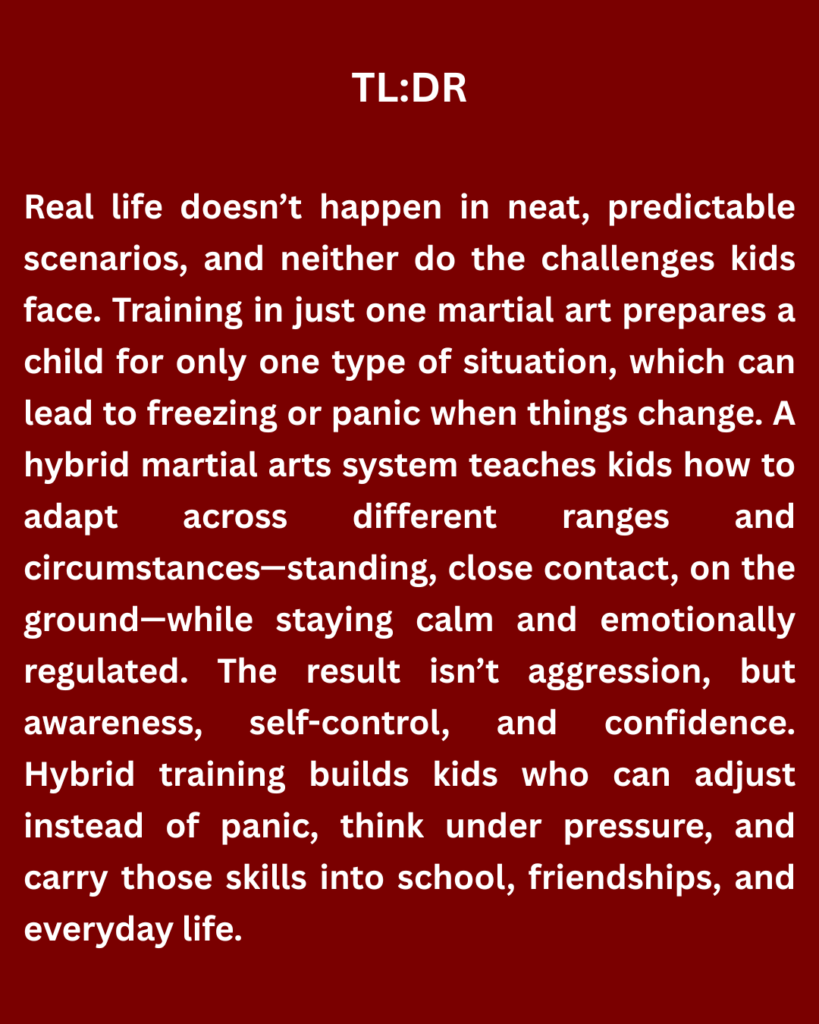 Children don’t experience life in a controlled environment. They deal with crowded hallways, unexpected physical contact, emotional pressure, and moments where panic matters more than perfect technique. A child who is only trained for one scenario may freeze when the situation changes. That’s why adaptability matters more than specialization.